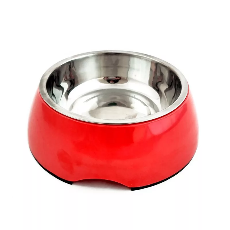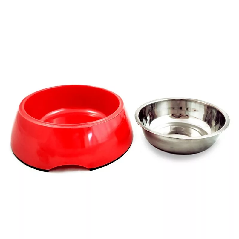 Comedero 2 en 1 de color rojo. Se compone de dos recipientes: uno exterior, de plástico altamente resistente, y uno interior, fabricado en metal. Ingenioso y versátil, puede utilizarse como un único recipiente de contenedor extraíble para facilitar su manejo y limpieza, o como dos comederos independientes, de transporte y almacenaje cómodo e inteligente. Provisto de goma antideslizante para evitar accidentes durante la comida de su mascota.