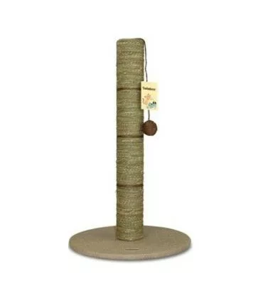 Rascador para gatos con base redonda, forrado con cuerda y con una bola para que además de rascar jueguen con ella.