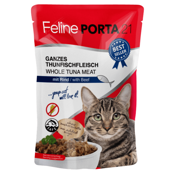 La comida húmeda Porta 21 es un ALIMENTO COMPLEMENTARIO para gatos de cualquier tamaño y edad. Elaborados con ingredientes de la mejor calidad apto para el consumo humano. ¡Sin cereales!