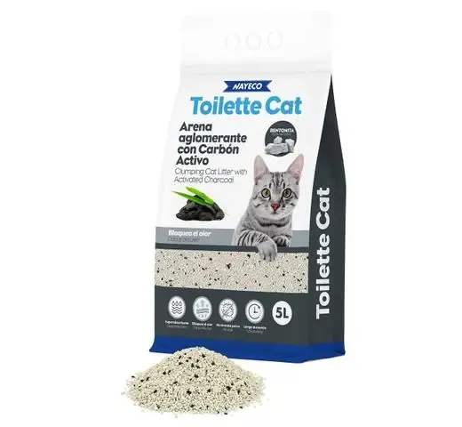 ARENA NAYECO AGLOMERANTE CON CARBÓN ACTIVO es una arena para gatos de bentonita de origen natural con gran capacidad de aglomeración. Alta capacidad de absorción, lo que facilita la eliminación de los desechos en forma de aglomerado, manteniendo la caja de arena más limpia.