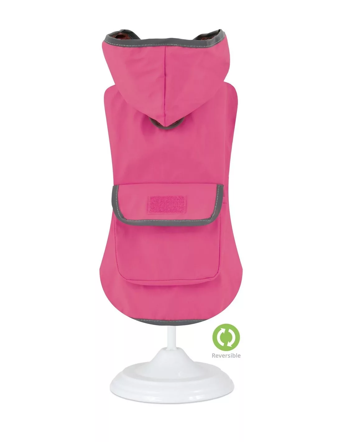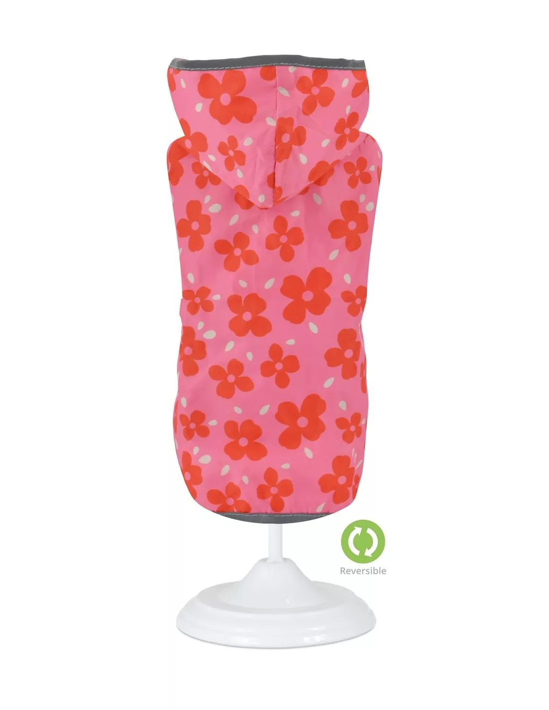 Por un lado es de color rosa con ribete reflectante, y por el otro es de flores rosas, muy bonito y original.