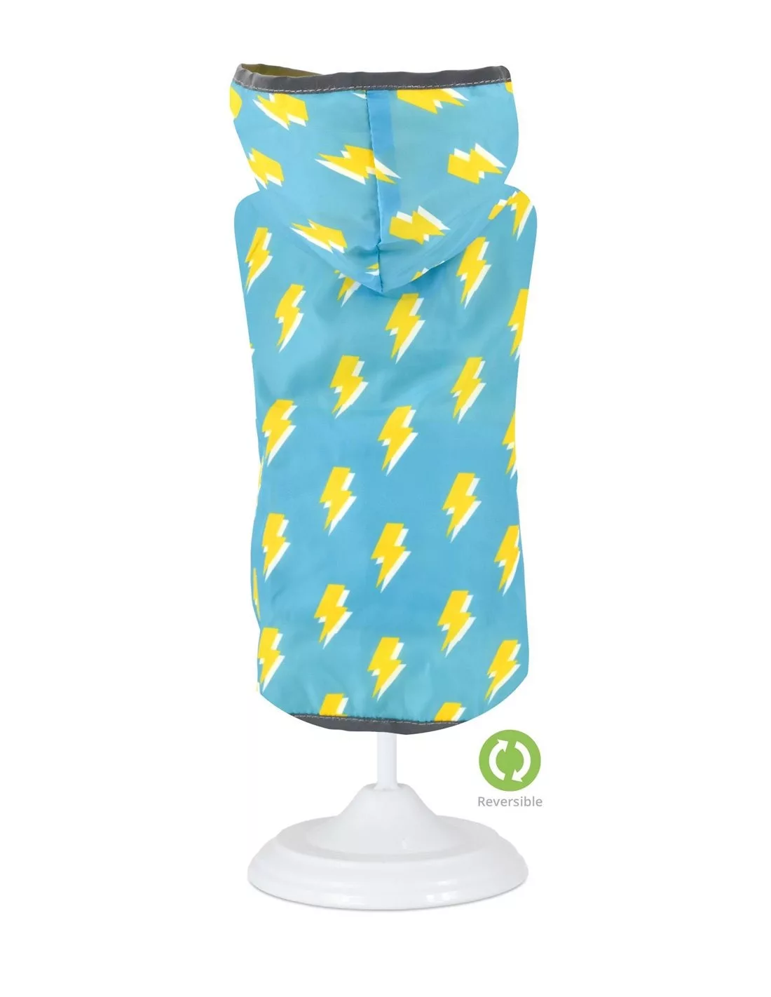 Por un lado es de color amarillo con ribete reflectante, y por el otro es azul con rayos, muy bonito y original.