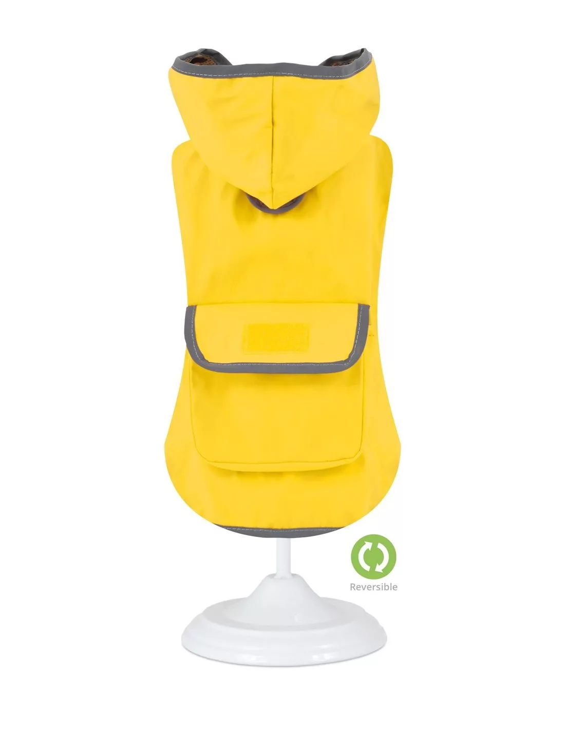Divertido impermeable reversible, que además es muy cómodo porque dispone de un bolsillo que sirve para doblar el propio impermeable y guardarlo.