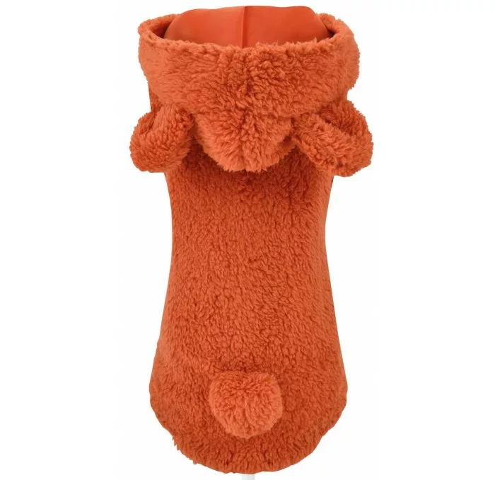 Chaqueta muy calentita de textura peluche, con una capucha que tiene dos orejotas y un pompón en la parte de atrás que lo hace muy graciosa puesta. Por dentro tiene forrito de raso y se abrocha con velcros en el pecho.