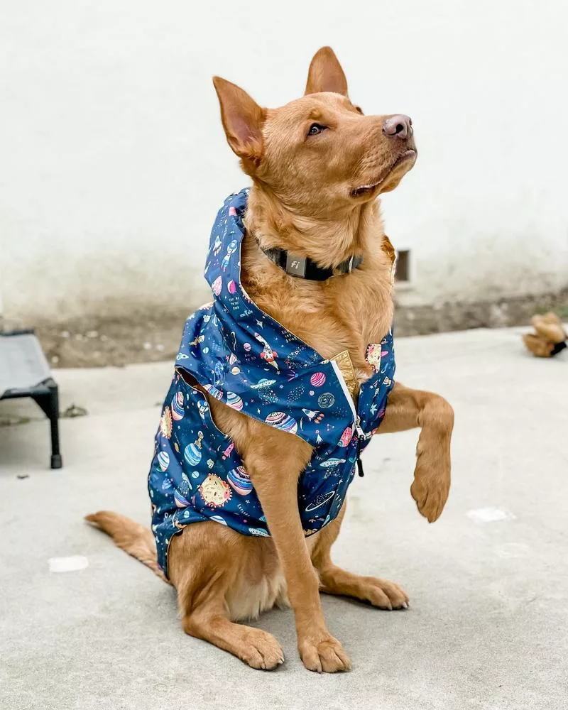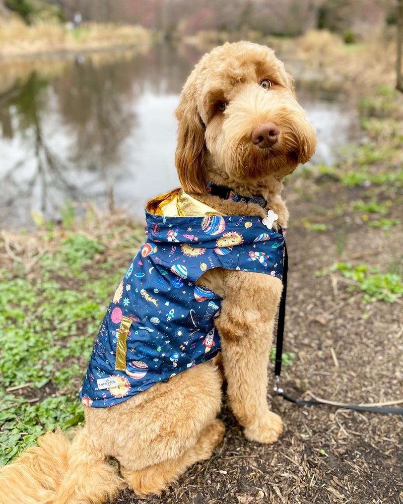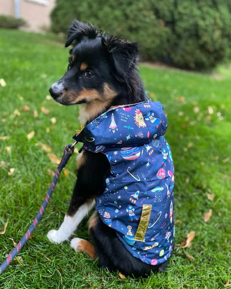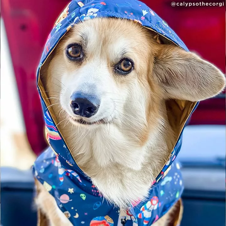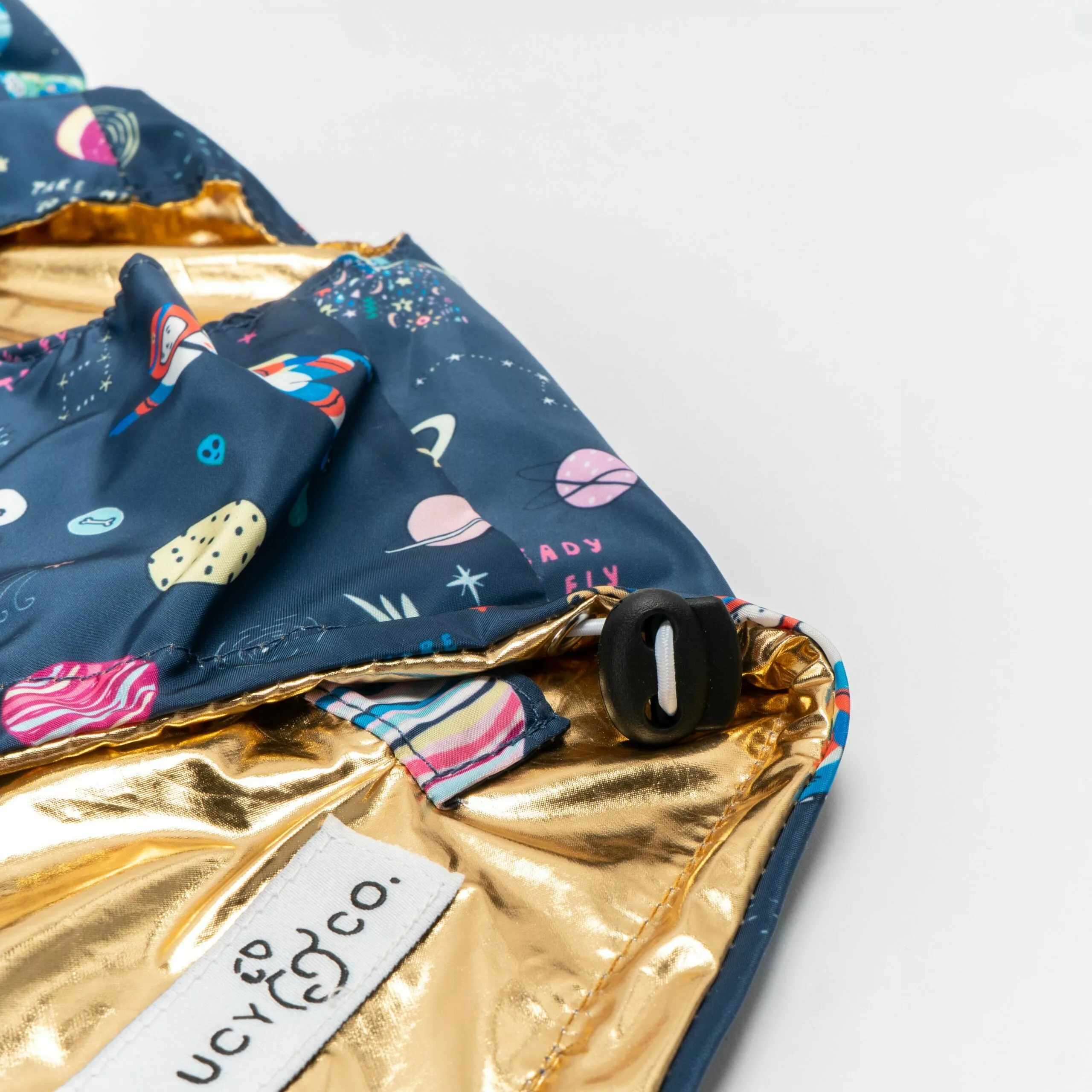 • Reversible: Por un lado es un chubasquero Dorado muy galáctico y por el otro es un divertido impermeable de planetas y naves espaciales