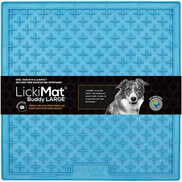 Las alfombras LickiMat están fabricadas con látex, se limpian fácilmente, son antideslizantes y tienen un tamaño de 20 cm x 20 cm. Es perfecta para perros que comen demasiado rápido y con ansia. Puede utilizarse a modo de juguete interactivo para perros que necesitan enriquecimiento ambiental, que tienen problemas de ansiedad o con conductas destructivas. Fomenta un comportamiento tranquilo en situaciones estresantes, como los fuegos artificiales, tormentas, las estancias fuera de casa, visitas, etc. Les mantendrá totalmente distraídos y centrados en una actividad relajante.