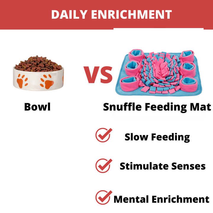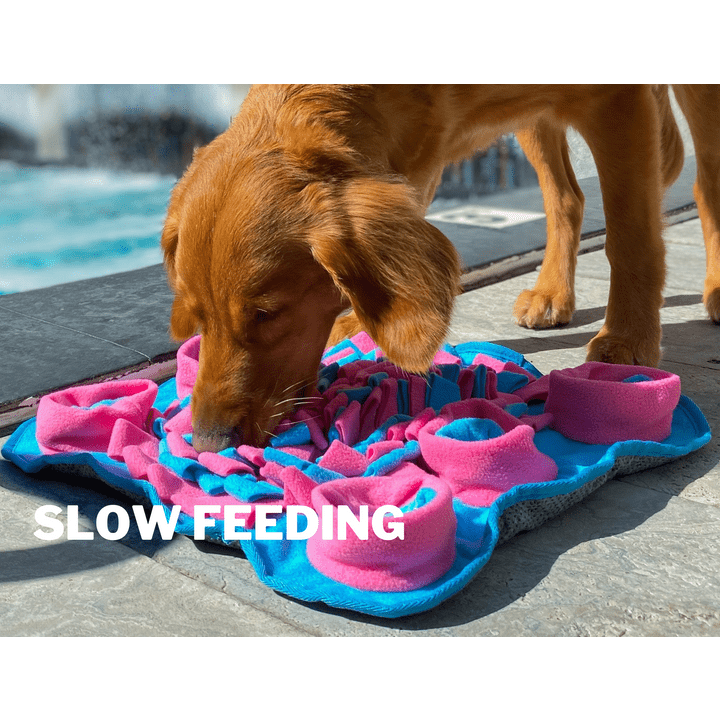 Las alfombras de olfateo son una manera divertida de estimular la mente de nuestros peludos, mientras que olfatean gastan energía y desarrollan su capacidad mental. Es perfecta para días que no hemos podido salir mucho con ellos o incluso para servir su ración de comida (en el caso de que sea pienso) a los perros con ansiedad. Será una manera divertida de ganarse su comida.