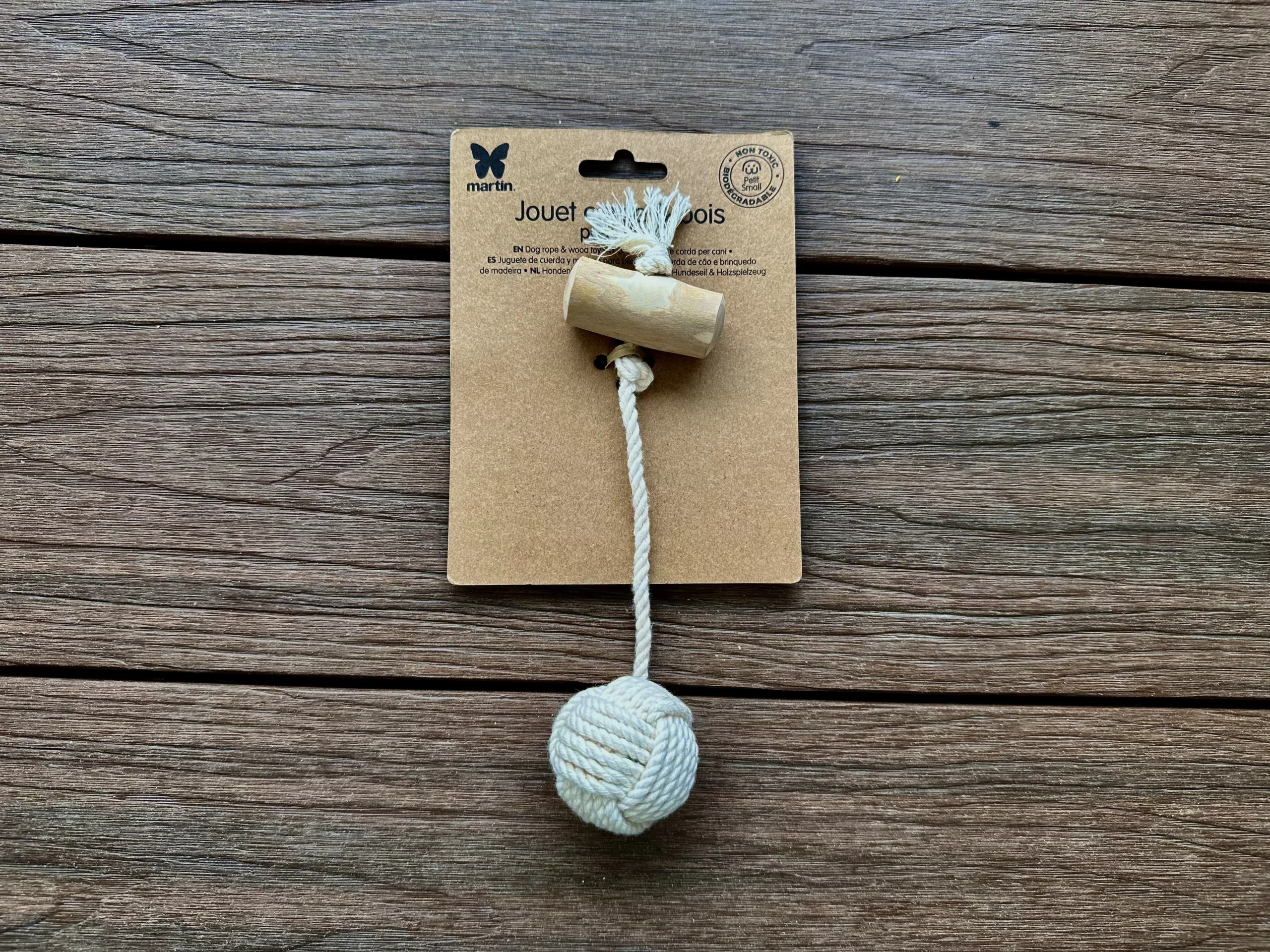 Juguete resistente con un trocito de madera de café que es un mordedor super duro e ideal para perros que les encanta morder trozos de madera. Este mordedor es de tamaño pequeño para perritos pequeños, tiene una pelota que contiene otra en su interior que hace un sonido tipo sonajero. La cuerda es 100 algodón.