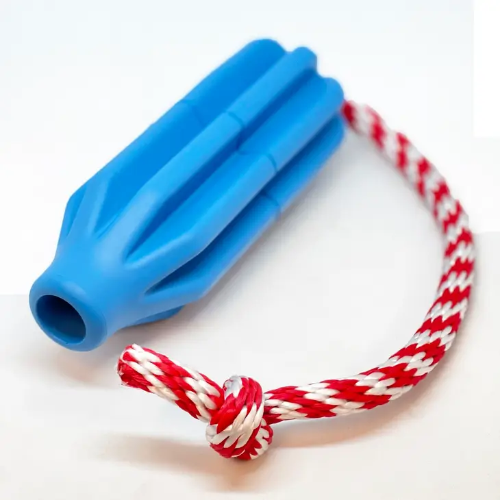 Juguete con forma de cohete para jugar al tira y afloja, para lanzar y para morder, es muy duradero y aguanta los mordiscos más fuertes, también tiene una ranura alargada para meter snacks o comida húmeda. De la linea de juguetes Sodapup USA-K9, ¡Muy originales y super divertidos!