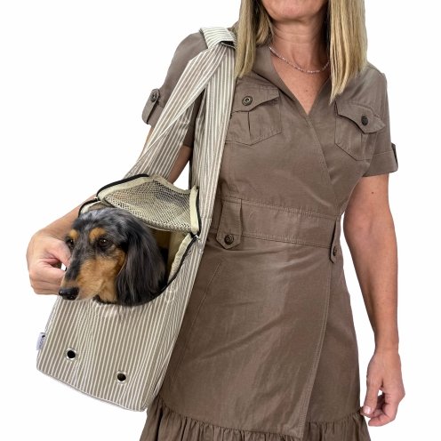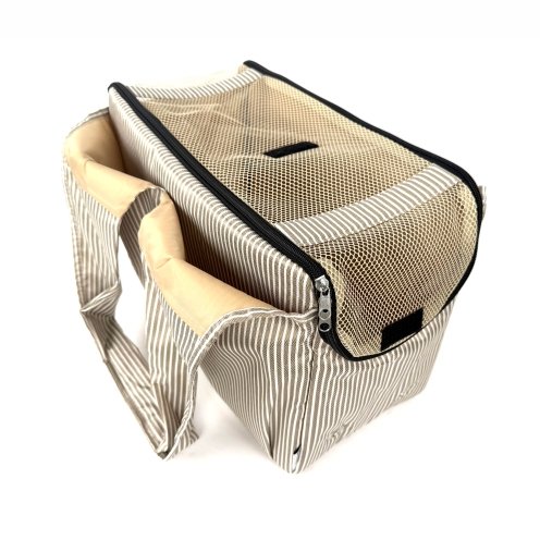 El bolso transportín a rayas en tonos arena combina estilo y funcionalidad para que puedas llevar a tu perro o gato de manera cómoda y segura. Es perfecto para salidas, viajes cortos, paseos por la ciudad o visitas al veterinario.