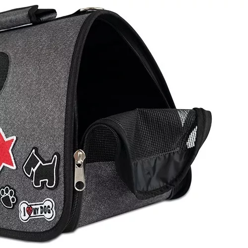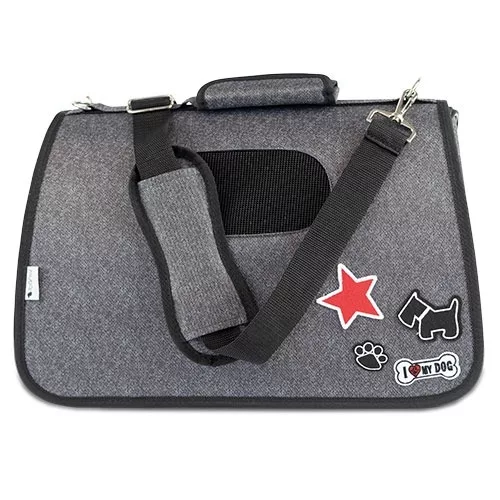 Práctico y elegante bolso para transportar su perro o gato de forma segura. Decorado con unos originales parches sobre fondo gris.