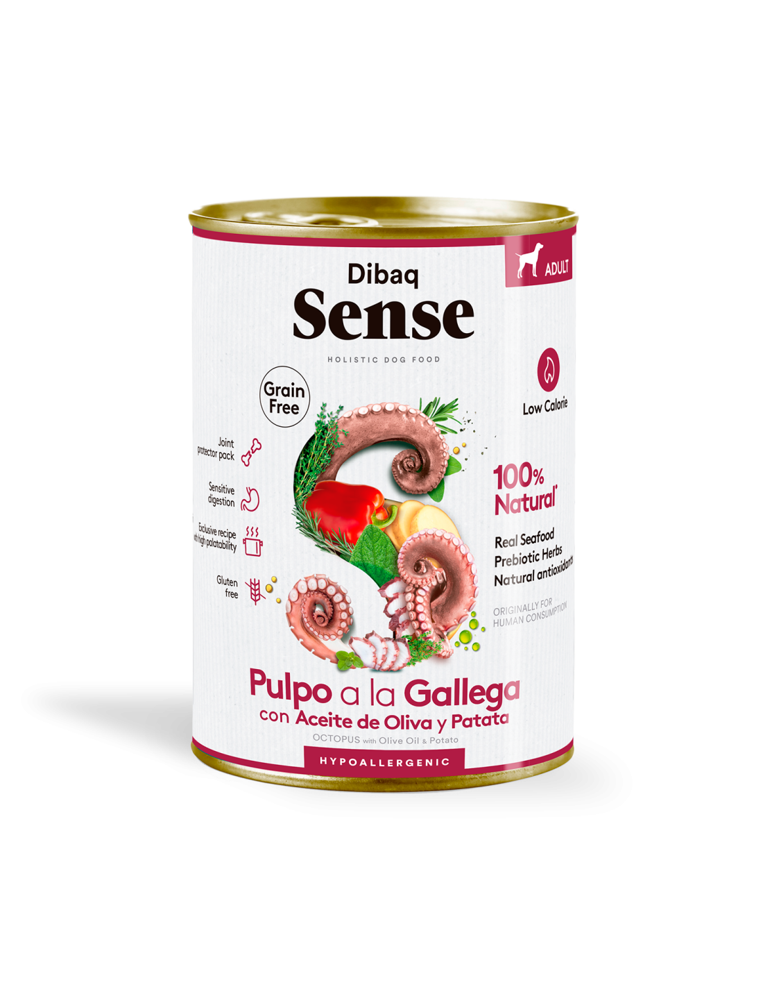 Pulpo fresco 42%*, pescado blanco fresco 40%*, patata 11%, aceite de oliva 1%*, pimiento rojo fresco 1%*, aceite de salmón 1% (fuente de ácidos grasos omega 3 y 6), pack protector articular 0,5% (condroitina sulfato, glucosamina clorhidrato y MSM), sustancias minerales, plantas aromáticas con propiedades antioxidantes naturales 0,02% (romero 0,01%*, tomillo 0,005%* y orégano 0,005%*). *Ingredientes naturales.