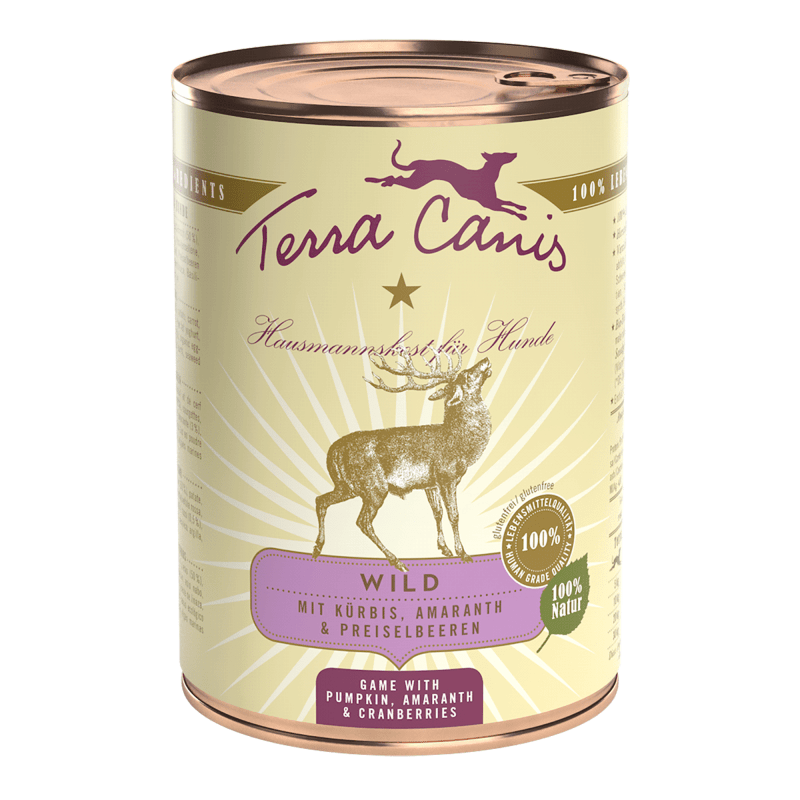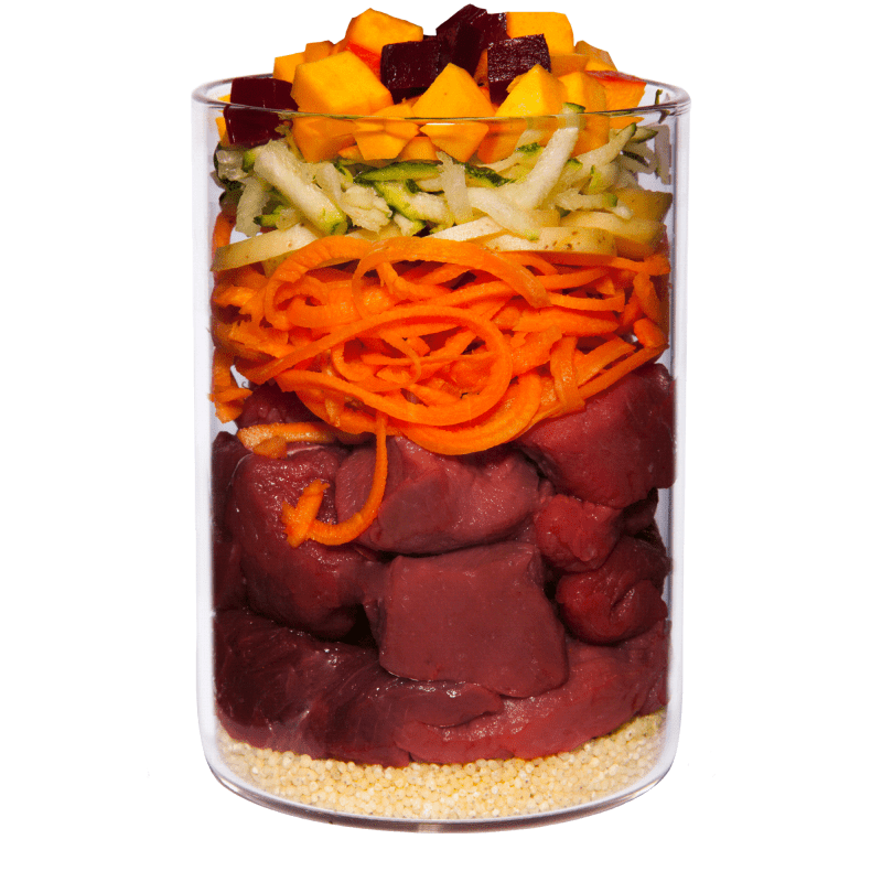 Carne muscular de corzo y ciervo (50%), patata, zanahoria, calabaza (8%), calabacín, apio nabo, yogur desnatado, remolacha, amaranto (3%), aceite de linaza, arándano rojo (0,5%), polvo de cáscara de huevo (0,4%), levadura de cerveza, cebollino, albahaca, alga marina (0,13%), arcilla mineral y polen de flor.