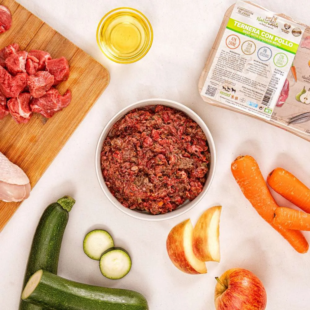 Composición: Hueso carnoso de pollo: 35%, carne de ternera: 15%, Carne de pollo: 10%, Molleja de pollo: 10%, Hígado de ternera: 5%, Tripa verde de ternera: 5%, Manzana: 4%, Zanahoria: 3%, Calabacín: 3%, Pulmón de ternera: 2%, Corazón de ternera: 2%, Brócoli: 2%, Sesos de ternera: 1%, Riñón de ternera: 1%, Perejil: 1%, Ascophyllum nodosum (algas marinas y Aceite de oliva: 1%