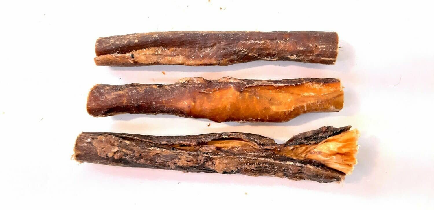 Palitos hechos de carne tierna de faringe/esófago de ternera. Carne muy magra, secada en rollos.