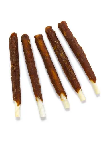 COMPOSICIÓN: Salmón 55%, Piel bovina 37%, Almidón de maíz 2%, Proteína de soja 1,5%, Emulgente Glicerina 2,2%, Edulcorante Sorbitol 2%, Sal 0,2%. Aditivos: Conservante Sorbato de Potasio 0,1% (E-202).