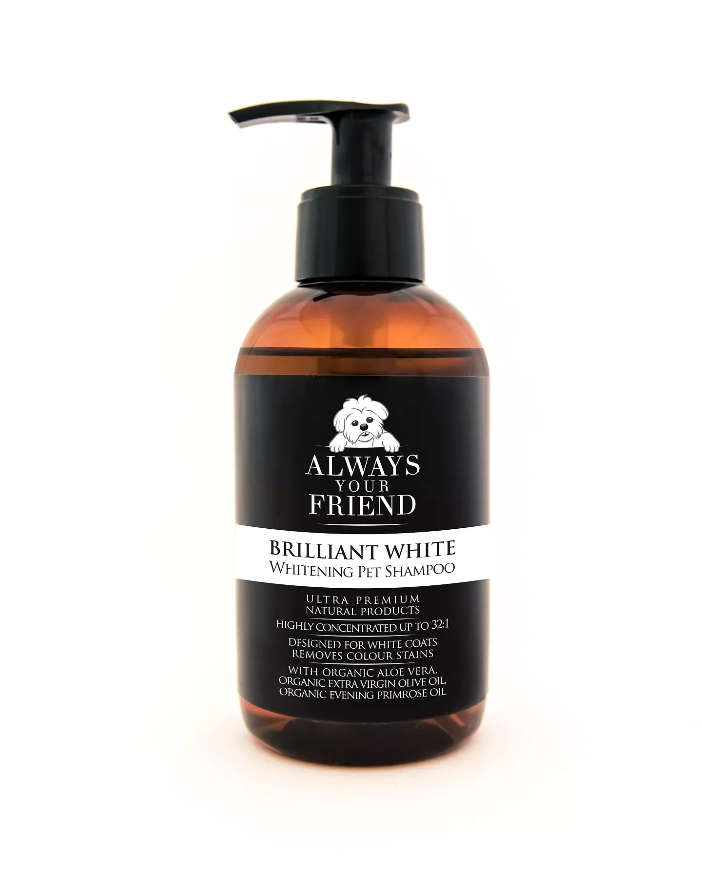 Brilliant White Shampoo está muy concentrado. Use 1 parte de champú hasta 32 partes de agua tibia. Por ejemplo, en una mascota de tamaño mediano, use una botella vacía para agregar 20ml de champú y 640ml de agua tibia y luego agite bien durante 10 segundos.